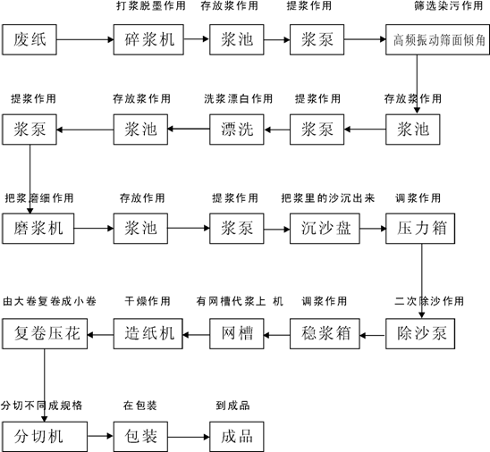 由廢紙進(jìn)入水力碎漿機(jī),水力碎漿機(jī)對(duì)廢紙進(jìn)行作打漿脫墨,打漿脫墨后的紙漿流入漿池;由提漿泵把紙漿從漿池提入高頻振動(dòng)篩,高頻振動(dòng)篩起到篩選雜物分離作用;篩選后到流入漿池,再由漿泵提入漂洗機(jī),作用是洗漿干凈,漂白;漂白后自動(dòng)流入漿池;再由漿提入磨漿機(jī),經(jīng)磨漿磨成細(xì)漿后,自動(dòng)流入漿池再由漿泵提入沉沙盤,沉沙盤的作用是將沙灰等雜質(zhì)沉淀分離出去,后制成純漿,再由除沙泵提入穩(wěn)漿箱,穩(wěn)漿箱作用是調(diào)和漿的濃度,之后自動(dòng)流入網(wǎng)槽后,由網(wǎng)籠毛毯帶漿進(jìn)入烘缸。(烘缸是起烘干作用)后進(jìn)入成品卷紙。卷紙后進(jìn)入復(fù)卷機(jī),復(fù)卷的作用是起復(fù)卷打孔壓花作用。由大卷復(fù)卷成小卷,后進(jìn)入分切機(jī),分切機(jī)的作用是起分切,不同規(guī)格長(zhǎng)短作用,后經(jīng)包裝到成品。注:鍋爐是起到熱氣的作用,送入烘缸起到干燥紙的作用。